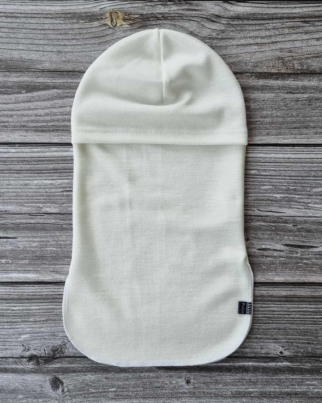 Aikuisten luonnonvalkoinen merino kypärämyssy kasvosuojalla
