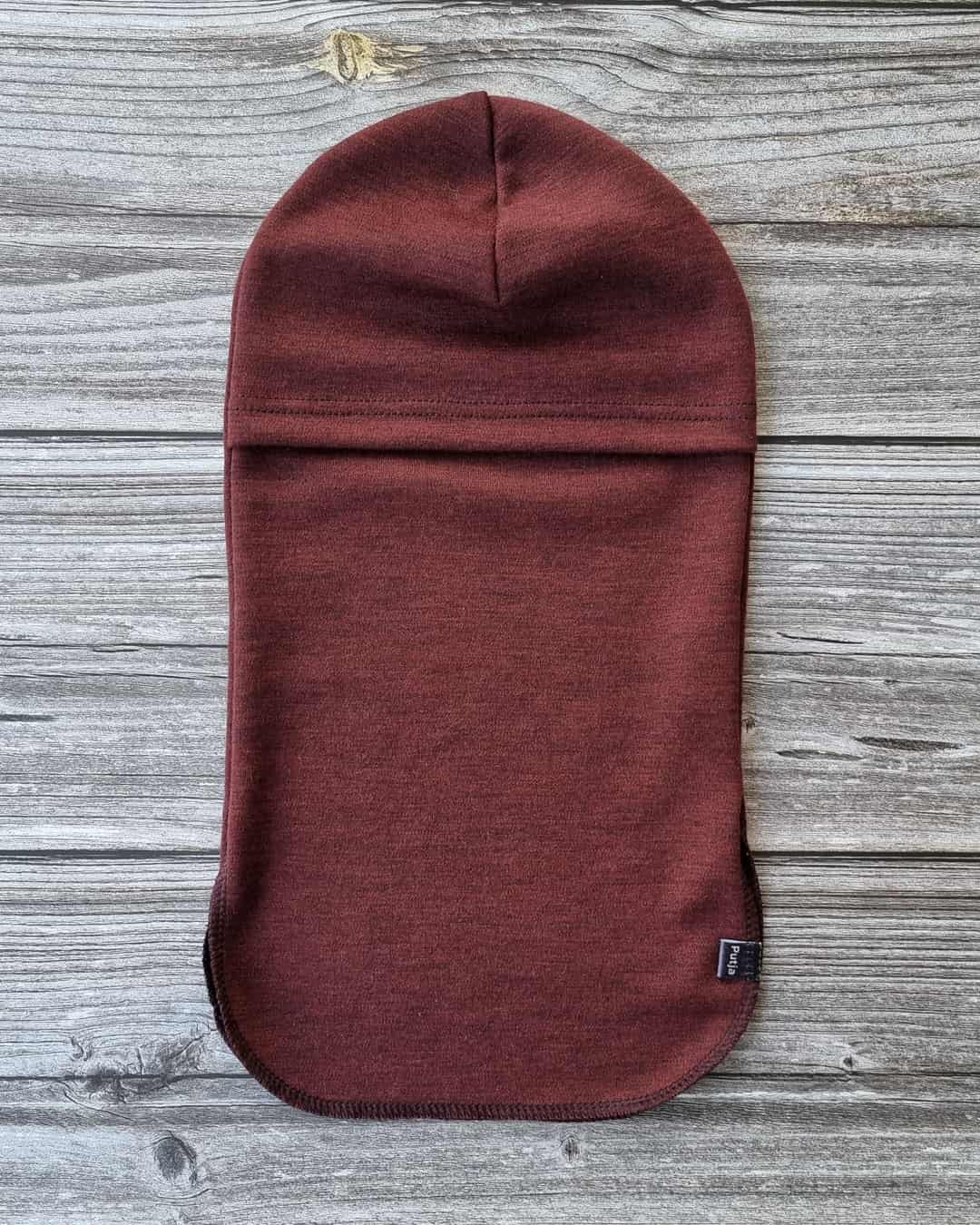 Lasten rubiininpunainen merino kypärämyssy kasvosuojalla