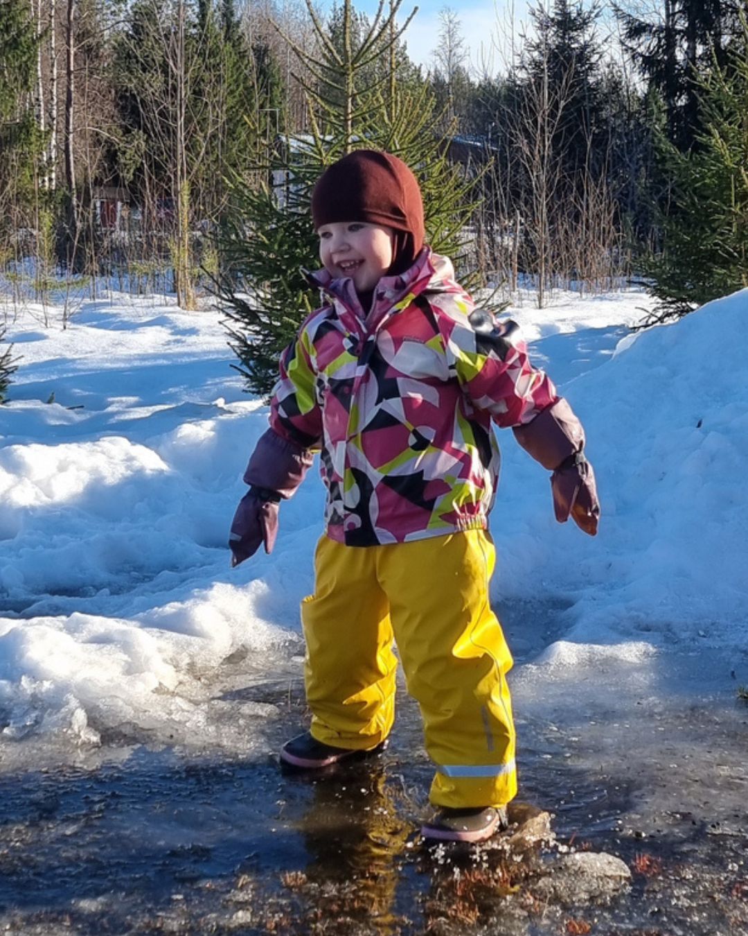 Lasten asusteet on herkkiä kastumaan. Merinovilla lämmittää myös kosteana ja on siksi hyvä materiaali lasten asusteisiin. Märkä merino kypärähuppu ei tunnu yhtä epämukavalta, kuin märkä puuvillainen kypärähuppu. Merino myös kuivuu nopeasti.